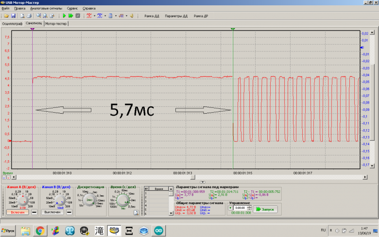 Где t= 4.5. При плавном увеличении frequency, имитация повышения оборотов двигателя, в диапозоне ~ 1500-2500 оборотов форсунки находятся в открытом состоянии (как буддто зависают). В чем может быть проблема? Менять значение t?
