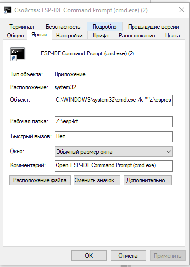 в поле объект - C:\WINDOWS\system32\cmd.exe /k ""z:\espressif\idf_cmd_init.bat" "z:\Python37-32\" "C:\Program Files\Git\cmd\""
