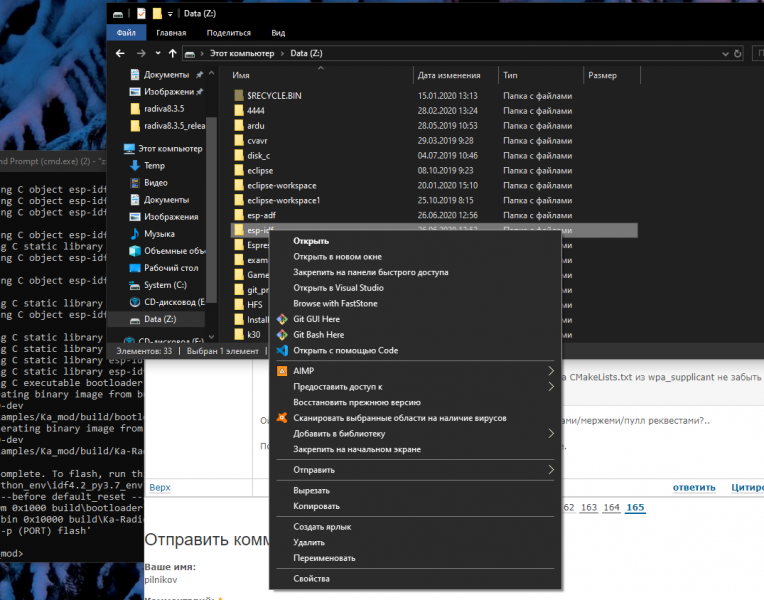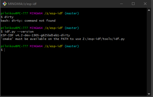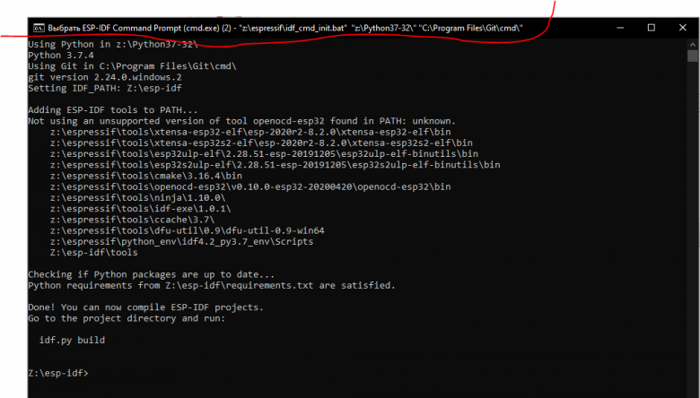 P.P.S. Для тех, кто будет следовать по этому пути: сейчас у меня, похоже не хватает путей в ENVIRONMENT или в настройках самого esp-idf, поэтому после каждого запуска командной строки (для сборки прошивки) приходится делать export.bat