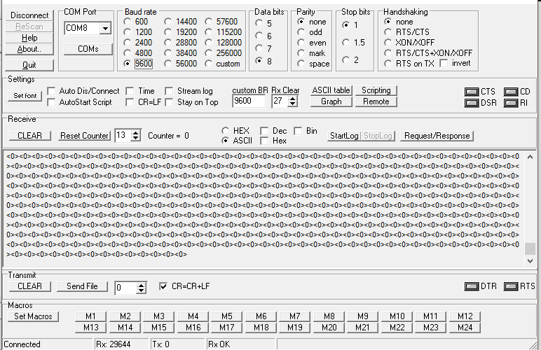 И модуль, и Дуня настроены на одну и ту же скорость 115,2кбод