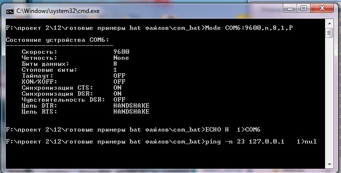 Чет я погарячился, нифига не работает, сейчас ошибок нет никаких, но не работает,посылаю команду через батник,огоньки на ардуино весело помаргивают как бэ намекая что обмен происходит но ничего не срабатывает по факту.Я прописываю букву "H" как в втором примере,и нифига.Открываю ардуиновский манитор порта,вписываю туда эту букву,все работает,а через батник не работает,огоньки rx tx на ардуино пморгают и все. Что за?