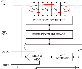 Внутри МК паралельно аналоговым входам (АЦП с мультиплексором) подключены цифровые выводы (порт ввода-вывода) т.е. на одних и тех же ногах МК при вызове функции analogRead() мы работаем с АЦП, а при вызове pinMode(), digitalWrite(), digitalRead() мы работаем с портом ввода-вывода.