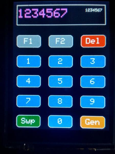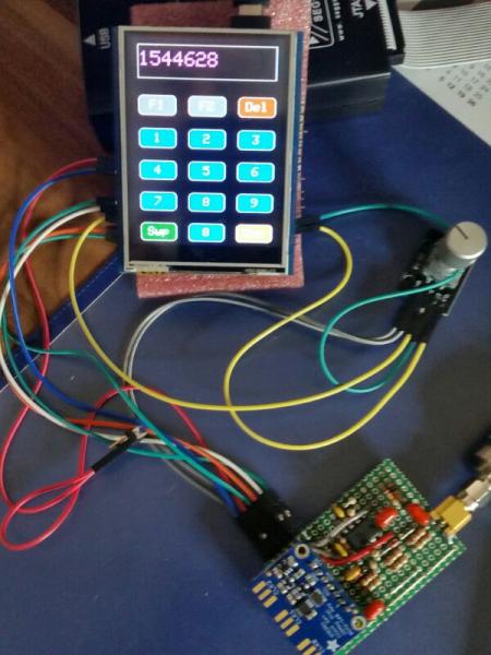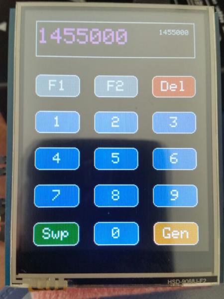 //if a numberpad button, append the relevant # to the textfield if (b>=3 ){ if (textfield_i < TEXT_LEN) { textfield[textfield_i] = buttonlabels[b][0]; textfield_i++; textfield[textfield_i] = 0; // zero terminate } }if (b == 0) { tft.setCursor(180,20); tft.setTextColor(ILI9341_WHITE, ILI9341_BLACK); tft.setTextSize(1); long int rezultat = 0; for (textfield_i = 0; textfield_i < 7; textfield_i++) { rezultat = 10 * rezultat + textfield[textfield_i] - 48; } si5351.set_freq(rezultat*1000ULL, SI5351_PLL_FIXED, SI5351_CLK0); tft.print(rezultat); }// F1 frequency Start if (b == 0) { tft.setCursor(180,20); tft.setTextColor(ILI9341_WHITE, ILI9341_BLACK); tft.setTextSize(1); int sig; long int F = 0; for (sig = 0; sig < textfield_i; sig++) { F = 10 * F + textfield[sig] - 48; } si5351.set_freq(F*100000ULL, SI5351_PLL_FIXED, SI5351_CLK0); tft.print(F); }