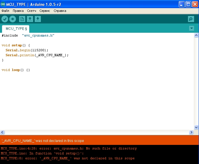 #include "avr_cpunames.h" void setup() { Serial.begin(9600); Serial.println(_AVR_CPU_NAME_); } void loop() {}Все прекрасно компилируется