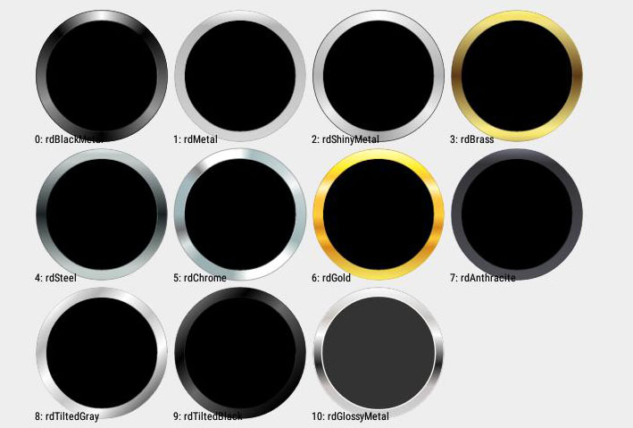 Здесь id - идентификатор нового индикатора, x,y и r - координаты центра и радиус индикатора, frameType - тип ободка, bgColor - цвет (текстура) циферблата, ptrType и ptrColor - тип и цвет стрелки.