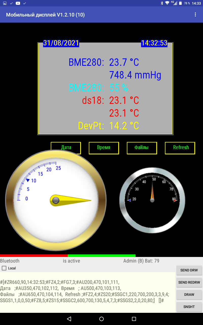 #include <SoftwareSerial.h> // библиотека, автоматизирующая процесс создания управляющих строковых последовательностей #include <mdwriter.h> #include <mdsender_bt.h> SoftwareSerial mySerial(7, 6); // RX, TX MD_Sender_BT mdScout; String cmdBuffer,sResponse; void setup() { // Open serial communications and wait for port to open: Serial.begin(9600); while (!Serial) { ; // wait for serial port to connect. Needed for native USB port only } Serial.println("+--------------== avr_test_MD_BT ==--------------+"); Serial.println("| testing communication with MoDyz via Bluetooth |"); Serial.println("+------------------------------------------------+"); // set the data rate for the SoftwareSerial port mySerial.begin(9600); sResponse = ""; cmdBuffer = ""; } void loop() { // run over and over char c; if (mySerial.available()) { c = (char)mySerial.read(); Serial.write(c); if (c==0x0A || c==0x0D) interpreteCommand(); else cmdBuffer=cmdBuffer+c; } if (Serial.available()) { mySerial.write((char)Serial.read()); } } void sendString() { for(int i=0;i<sResponse.length();i++) { mySerial.write(sResponse.charAt(i)); Serial.write(sResponse.charAt(i)); } mySerial.write('\r'); mySerial.write('\n'); Serial.write('\r'); Serial.write('\n'); sResponse = ""; } void addCmdString(String sCmd) { sResponse += sCmd; if(sResponse.length()>100) sendString(); } void drawScene() { int x,y,r; r = 180; sResponse = ""; addCmdString(mdScout.setDisplayColors(C_BLACK,C_LTGRAY)); addCmdString(mdScout.setLineColors(C_LTGRAY,C_MAGENTA)); addCmdString(mdScout.fillRectangleBG(150,10,680,50)); addCmdString(mdScout.setTextColors(C_RED,C_LTGRAY)); addCmdString(mdScout.setTextSize(30)); addCmdString(mdScout.setTextColors(C_BLUE,C_LTGRAY)); addCmdString(mdScout.outTextC(415,40,"Gauges")); addCmdString(mdScout.setLineColors(C_RED,C_MAGENTA)); addCmdString(mdScout.setLineWidth(4)); addCmdString(mdScout.drawPoint(415,40-4)); addCmdString(mdScout.drawPoint(415,40)); addCmdString(mdScout.setLineWidth(1)); addCmdString(mdScout.fillRectangleBG(150,10+r*2+r/5,680,50+r*2+r/5)); addCmdString(mdScout.setTextColors(C_RED,C_LTGRAY)); addCmdString(mdScout.setTextColors(C_RED,C_LTGRAY)); addCmdString(mdScout.outTextL(320,40+r*2+r/5,"Rotary knobs")); addCmdString(mdScout.setLineColors(C_BLUE,C_MAGENTA)); addCmdString(mdScout.setLineWidth(4)); addCmdString(mdScout.drawPoint(320,40+r*2+r/5-4)); addCmdString(mdScout.drawPoint(320,40+r*2+r/5)); addCmdString(mdScout.setLineWidth(1)); addCmdString(mdScout.setTextSize(25)); addCmdString(mdScout.setTextColors(C_YELLOW,C_LTGRAY)); x = r+r/10; y = r+r/10; addCmdString(mdScout.ssgCreate(1, x, y, r, 1, 1, 1, 2)); addCmdString(mdScout.ssgDefineScala(1, 1, 0, 10, 70)); addCmdString(mdScout.ssgSetValue(1, 40)); x = x+r*2+r/5; addCmdString(mdScout.ssgCreate(2, x, y, r, 2, 2, 2, 3)); addCmdString(mdScout.ssgDefineScala(2, 2, 0, 0, 140)); addCmdString(mdScout.ssgSetValue(2, 40)); addCmdString(mdScout.setTextSize(15)); addCmdString(mdScout.setTextColors(C_RED,C_LTGRAY)); x = r+r/10; y = y+r*2+r/5; addCmdString(mdScout.defineRotaryButton(13, x-r, y-r, r*2, -180, 0, 10, 70)); x = x+r*2+r/5; addCmdString(mdScout.defineRotaryButton(14, x-r, y-r, r*2, -225, 45, 0, 140)); sendString(); } void setGaugeValue(int id, int v) { Serial.print("set Gauge "); Serial.print(id); Serial.print(" to "); Serial.println(v); addCmdString(mdScout.ssgSetValue(id-12,v)); sendString(); } void interpreteCommand() { if(cmdBuffer.length()==0) return; if(cmdBuffer.equals("fun1")) {Serial.println("Command to draw: "+cmdBuffer); drawScene();} else if(cmdBuffer.equals("redrw")) {Serial.println("Command to redraw: "+cmdBuffer);} else if(cmdBuffer.substring(0,5).equals("#FR13")) setGaugeValue(cmdBuffer.substring(3,5).toInt(),cmdBuffer.substring(6,cmdBuffer.length()-1).toInt()); else if(cmdBuffer.substring(0,5).equals("#FR14")) setGaugeValue(cmdBuffer.substring(3,5).toInt(),cmdBuffer.substring(6,cmdBuffer.length()-1).toInt()); else { Serial.print("Unknown command: <"); Serial.print(cmdBuffer); Serial.println(">"); } cmdBuffer = ""; }В результате взаимодействия смартфона (или планшета) с установленным на него приложением MoDyz и вышеприведенного скетча получится вот такая картинка (та что справа - слева та картинка, которую выдает мой отладочный планшет с правами администратора aka бога):