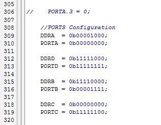 #include <mega16.h> #include <delay.h> #define prp 2 #define pluse 1 #define minuse 2 unsigned int current_prp; void main(void) { //----------------------------------------------------------------------------------------------------------------------- //PORTS Configuration DDRA = 0b00001000; PORTA = 0b00000000; DDRD = 0b11111000; PORTD = 0b11111111; DDRB = 0b11110000; PORTB = 0b00001111; DDRC = 0b00000000; PORTC = 0b11111100; while(1){ while(PINC.prp == 0){ if(PIND.pluse == 0){ current_prp++; delay_ms(250); if(current_prp >= 10000){ current_prp = 0; }; }; if(PIND.minuse == 0){ current_prp--; delay_ms(250); if(current_prp <= 0){ current_prp = 9999; }; }; }; } }будет очень интересен твой ответ