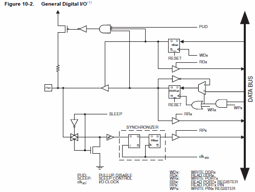 а ну теперь понятно. вы как раз про эту задержку синхронизации. а то я понял ваш первый пост в разнесенные во времени промежутке мы можем иметь разные значения на PORTB и PINB. получается они должны быть равны после устаканивания сигналов.