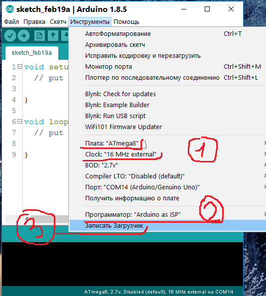 1. Шью через USBasp по spi, arduino IDE 1.8.5 (пока так удобнее), чип в заведомо рабочей плате