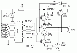 Посмотрел схему оповещателя сигнализации, усилитель собран на 6 транзисторах.