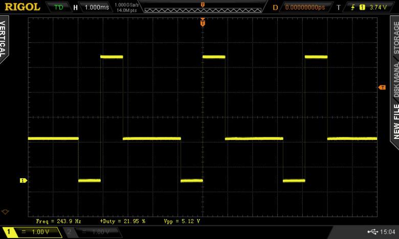 Частота изменяемая так как это тахометр (0-500 Гц), со скважностью не скажу, но по осцилу D(Duty Cycle) примерно 80%, но могу и ошибаться =\