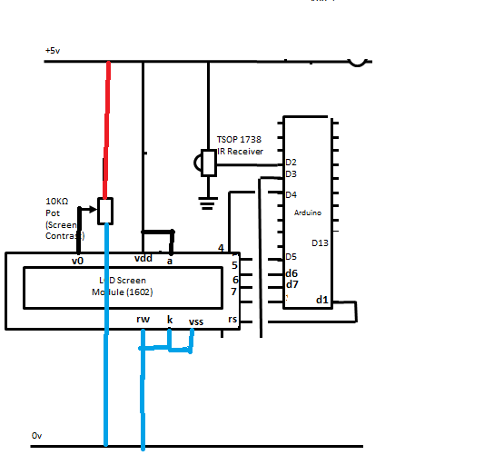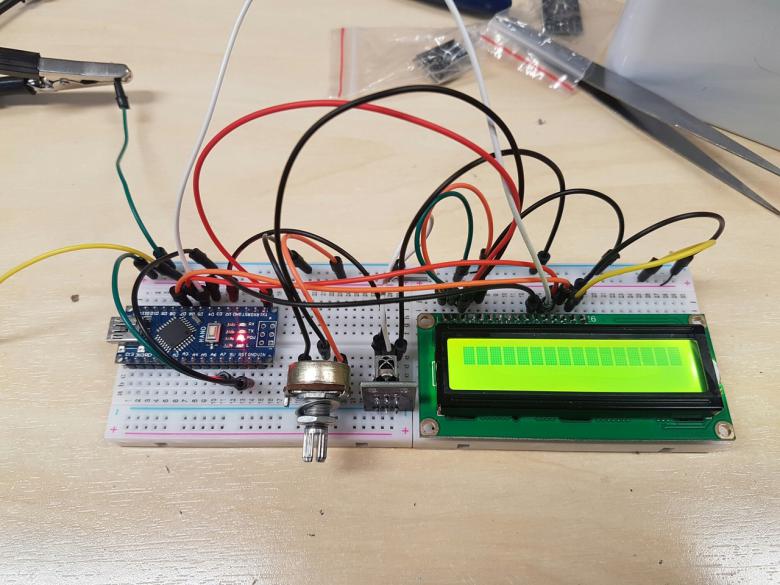 сем привет! Парни помогите пожалуйста разобраться. Короче решил я себе сделать счётчик времени круга на Ардуинке. Проэкт отыскал только на англ языка, короче собрал на макетке, но что то не фурычит. На экране нет никаких надписей. Вот ссылка на статью:https://qps.ru/BWwC0 и ссылка на скеч:https://qps.ru/QOczu . Подключал дисплей и ардуино так: