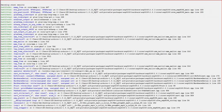 И так, после флуда вернусь к теме, продолжу диалог (или монолог, как получится). Исправил код по рекомендациям выше. Удалил указатели. Получается проблема не в них вовсе. Заметил что чаще ошибка вываливается в момент отправки данных по MQTT, когда с сервера отправляю в ESP. Но далеко не всегда, может просто в простое находится и "упасть".