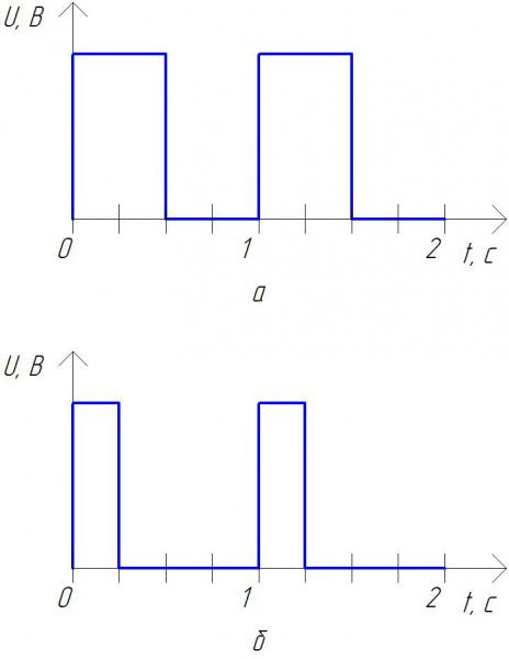 Например, на подграфике "а" я получил частоту 1 Гц, соответственно "длину волны" 1 с, а время импульса 0,5 с (или 50 % от длины волны). А вот на подграфике "б" при тех же Ч = 1 Гц и ДВ = 1 с уже другое время импульса 0,25 с (или 25 % от длины волны).