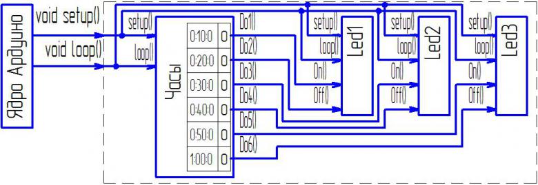 /**/ unsigned long mill;// переменная для millis() typedef void(*pDo)(); //---------------------- // класс светодиод class Cl_Led { protected: const byte pin; bool led; unsigned long past, time; byte state; //0 выкл/ 1 вкл / 2 мигать /*установить в состояние*/ void stand(byte state_) { past = mill; state = state_; switch (state) { case 0: // выкл digitalWrite(pin, led = LOW); break; case 1: // вкл digitalWrite(pin, led = HIGH); break; case 2:// мигать digitalWrite(pin, led = !led); break; case 3:// короткое выключение digitalWrite(pin, led = LOW); break; case 4:// короткое включение digitalWrite(pin, led = HIGH); break; } } public: /*конструктор*/ Cl_Led(byte pin_): pin(pin_) {} /*инициализация-вставить в setup()*/ void init() { pinMode(pin, OUTPUT); OFF(); } /*работа-вставить в loop()*/ void run() { if (state == 2 && mill - past >= time)stand(2); if (state == 3 && mill - past >= time)stand(1); if (state == 4 && mill - past >= time)stand(0); } /*включить*/ void ON() { stand(1); } /*коротко включить*/ void ON(unsigned long time_) { time = time_; stand(4); } /*выключить*/ void OFF() { stand(0); } /*коротко выключить*/ void OFF(unsigned long time_) { time = time_; stand(3); } /*мигать*/ void blink(unsigned long time_ = 200) { time = time_; stand(2); } }; //---------------------- struct schedule { const int hour; const int minute; const int sec; bool flag; const pDo Do; schedule(int h, int m, int s, const pDo D): hour(h), minute(m), sec(s), flag(0), Do(D) {} } ; class Cl_Timer { protected: byte num; schedule *TABLE; public: Cl_Timer(schedule *T, byte n): TABLE(T), num(n) {} void init() {} void run() {} }; //-----------Компоновка----------------------- Cl_Led Led1(/*пин*/13); Cl_Led Led2(/*пин*/12); Cl_Led Led3(/*пин*/11); void Do1() { Led1.ON(); Serial.println("Led1.ON"); } void Do2() { Led1.OFF(); Serial.println("Led1.OFF"); } void Do3() { Led2.ON(); Serial.println("Led2.ON();"); } void Do4() { Led2.OFF(); Serial.println("Led2.OFF"); } void Do5() { Led3.ON(); Serial.println("Led3.ON();"); } void Do6() { Led3.OFF(); Serial.println("Led3.OFF"); } const int num = 6; schedule TABLE[num] = { {/*час*/0,/*минута*/10,/*секунда*/0,/*обработчик*/&Do1 }, {/*час*/0,/*минута*/20,/*секунда*/0,/*обработчик*/&Do2}, {/*час*/0,/*минута*/30,/*секунда*/0,/*обработчик*/&Do3 }, {/*час*/0,/*минута*/40,/*секунда*/0,/*обработчик*/&Do4 }, {/*час*/0,/*минута*/50,/*секунда*/0,/*обработчик*/&Do5}, {/*час*/1,/*минута*/ 0,/*секунда*/0,/*обработчик*/&Do6} }; Cl_Timer Timer(TABLE, num); //---------------------------------- void setup() { Serial.begin(9600); Led1.init(); Led2.init(); Led3.init(); Timer.init(); } void loop() { mill = millis(); Led1.run(); Led2.run(); Led3.run(); Timer.run(); } /**/Разумеется туда надо поставить реальные часы
