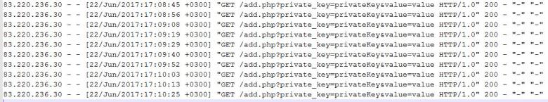// We now create a URI for the request String url = "/input/"; url += streamId; url += "?private_key="; url += privateKey; url += "&value="; url += value; Serial.print("Requesting URL: "); Serial.println(url); // This will send the request to the server client.print(String("GET ") + url + " HTTP/1.1\r\n" + "Host: " + host + "\r\n" + "Connection: close\r\n\r\n");И попробуйте строку запроса обернуть как в примере.